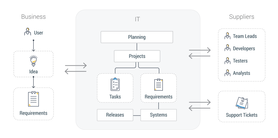 Store information about incoming business requests, projects, activities, releases and architecture components. Customizable data model, views and permissions